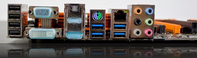 Moving to the back of the board now and we are met with the back panel connectors. Connectors here from left to right are 4 x USB 2.0, VGA D-SUB, DVI-D, Optical S/PDIF Out, HDMI, DisplayPort, PS/2 Keyboard/Mouse, 4x USB 3.0, RJ-45 LAN, and audio/mic in.