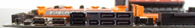 To the end of the board we have some more connectors. These are (again from left to right) 2x 2.0 USB, 6x SATA 6Gb/s, and 1x SATA Express port. The two USB ports featured here are incredibly handy if you use the board on a test bench setup as you can plug the keyboard and mouse in without having to run them to the other side of the system.