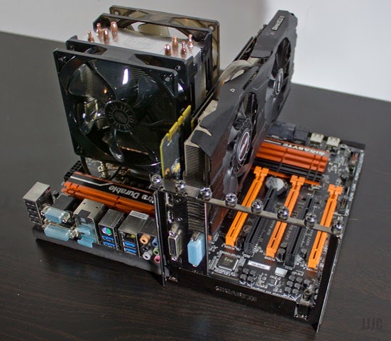 Here is a little snap showing the handiness of the OC Brace. For people who use the board on their test bench (like myself) the OC Brace is a great addition that supports heavy graphics cards so you don’t have to worry about them being unsupported and sagging or snapping. There is also plenty of room around the socket for installation of large coolers, while not the largest on the market my Coolermaster Hyper 212 was a breeze to install.